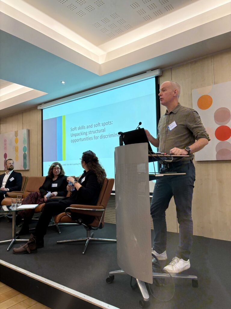 Jon Rogstad (Oslo Metropolitan University) omówił strukturalne uwarunkowania dyskryminacji. Pracodawcy postrzegają umiejętności twarde jako możliwe do wyuczenia, w przeciwieństwie do dopasowania do zespołu. W tym kontekście zatrudnienie niewłaściwej osoby jest szczególnie ryzykowne, prowadząc do preferencji dla homogenicznych zespołów. Dlatego umiejętności społeczne (zdolność do dopasowania się) są kluczowe dla grup szczególnie zagrożonych wykluczeniem. Ich umiejętności twarde mogą nie być wystarczające obok postrzeganego braku dopasowania. Prawo nie chroni przed tego rodzaju dyskryminacją.
