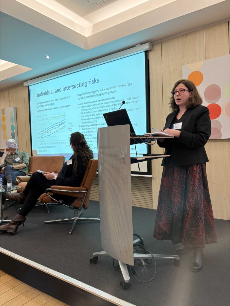 Iuliana Precupetu (Research Institute of the University of Bucharest) przyjrzała się czynnikom ryzyka pod koniec życia zawodowego. Mimo rosnących wskaźników zatrudnienia wśród pracowników w wieku 55-64 lat w całej UE, określone grupy pozostają zagrożone wykluczeniem. Ograniczenia zdrowotne są kluczowym powodem wcześniejszej emerytury, dodatkowo pogłębianym przez płeć żeńską i obowiązki opiekuńcze. Po stronie organizacyjnej, traktowanie różnorodności wiekowej jako zasobu (mentoring, zachowanie specjalistycznej wiedzy) przyczynia się do utrzymania starszych pracowników.