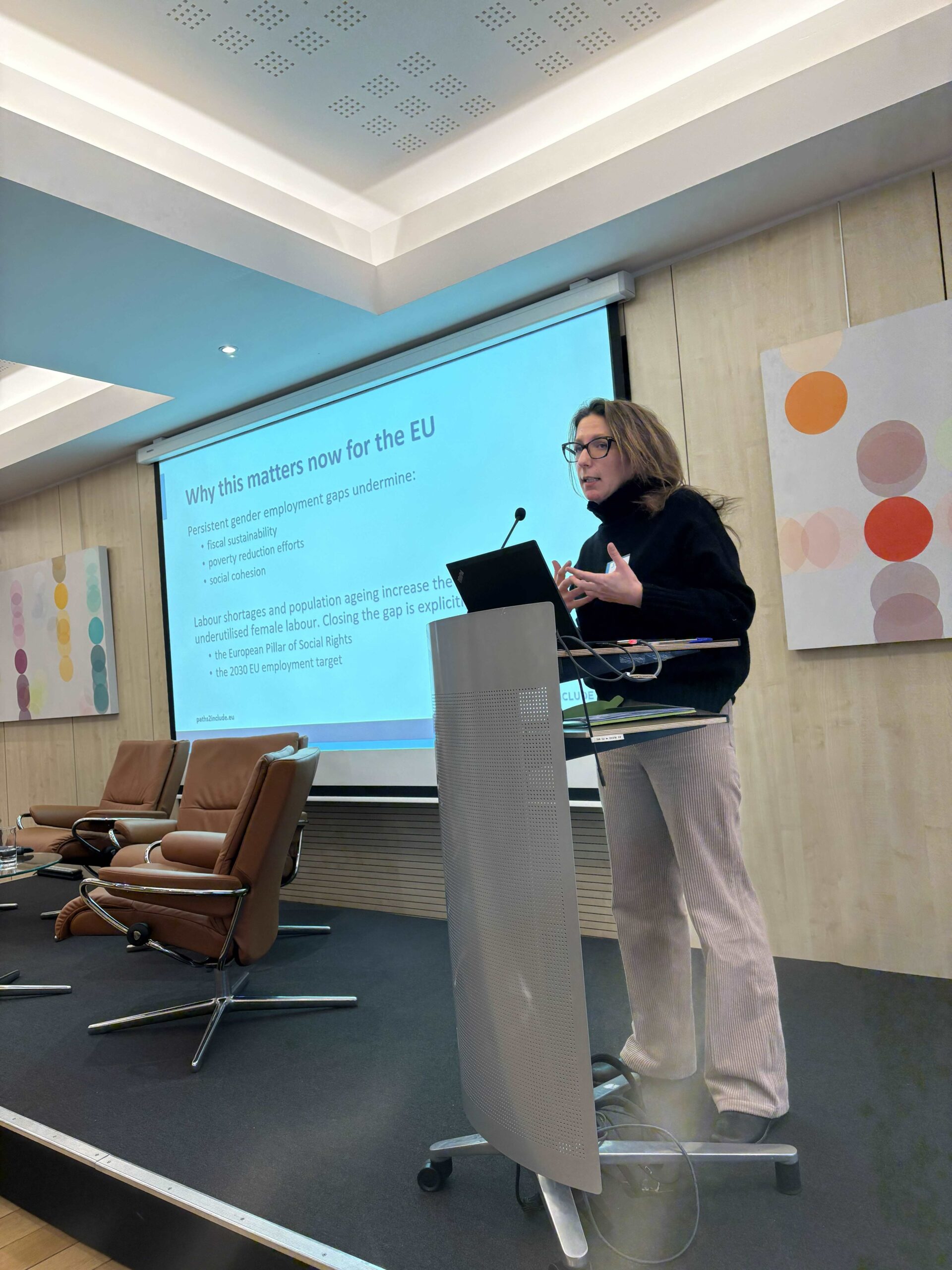 Arianna Vivoli i Federico Ciani (Action Research for Co-Development) przedstawili korzyści płynące z inkluzywnych rynków pracy. Luka w zatrudnieniu ze względu na płeć odzwierciedla niedostateczne wykorzystanie talentów kobiet. Utrzymujące się luki w zatrudnieniu ze względu na płeć zaburzają równowagę fiskalną, wysiłki na rzecz redukcji ubóstwa i spójność społeczną. Wyniki badania symulującego budżetowe i dystrybucyjne skutki zmniejszenia lub zamknięcia luki w zatrudnieniu ze względu na płeć wskazują na pozytywne efekty dla ogólnego dobrobytu. Zmniejszenie luki w zatrudnieniu ze względu na płeć zapewnia łatwiejsze domykanie budżetu, zmniejsza ubóstwo i ma umiarkowany wpływ na nierówności. Nawet częściowe zamknięcie ma znaczenie z perspektywy fiskalnej.