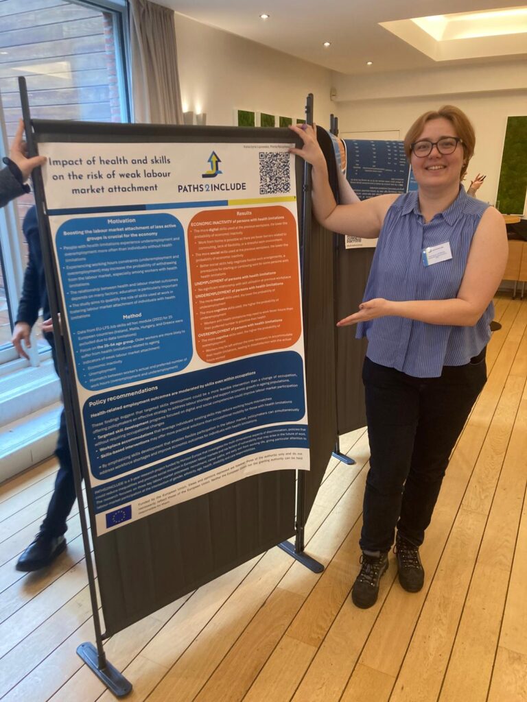 Katarzyna Lipowska (IBS) podzieliła się wynikami badania dotyczącego związku między umiejętnościami wykorzystywanymi w pracy a wynikami na rynku pracy wśród osób poniżej 55 roku życia z ograniczeniami zdrowotnymi. Wyniki sugerują, że dobre umiejętności cyfrowe i społeczne są kluczowe dla osób z ograniczeniami zdrowotnymi, aby pozostać aktywnym na rynku pracy. Z tego powodu ukierunkowane programy rozwoju umiejętności skoncentrowane na kompetencjach cyfrowych i społecznych mogłyby poprawić uczestnictwo w rynku pracy bez konieczności zmiany zawodu.